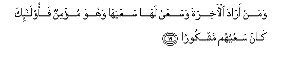 Dan sesiapa yang menghendaki akhirat dan berusaha mengerjakan amal-amal yang baik untuk akhirat dengan usaha yang layak baginya, sedang dia beriman, maka mereka yang demikian keadaannya, diberi pahala akan amal usahanya.